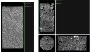 For quantitative analysis, it is difficult to scan a full size plug (1”d x 2”l) and be able to truly capture all of the aspects of the sample. For example, a mudstone or shale sample is going to be very tight, and the pores and pore throats are going to be as small as a few nanometers, but there will also be pores that are much larger in size, 10s to 100s of microns. This makes quantification difficult because, in this example, to properly image the full range of porosity the scan needs to be at such a high resolution to catch the small pore spaces that it is too high of a resolution to image the entire sample. If the resolution is low enough to catch the whole sample, I can’t see or quantify the smaller features or pore spaces. Another example of features of interest would be fractures or microcracks in rock samples.