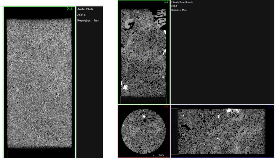 The big problem or goal that people are working towards is applying micro-CT in a way that helps predict reservoir behavior. Digital rock physics (DRP) or analysis allows us to run flow models through a sample or allows us to understand the mechanical properties of a sample, all the way up to modeling reservoir behaviors. There are multiple problems with DRP but, to put it simply, it is a complex scaling issue. It’s hard to get a scan or scans that scale appropriately to the full scale of a reservoir. It goes back to not being able to scan nano-porosity and macro-porosity in the same scan. Also, fractures in reservoirs make DRP more uncertain, and an understanding of various rock properties like mineralogy are also needed to properly build these models.