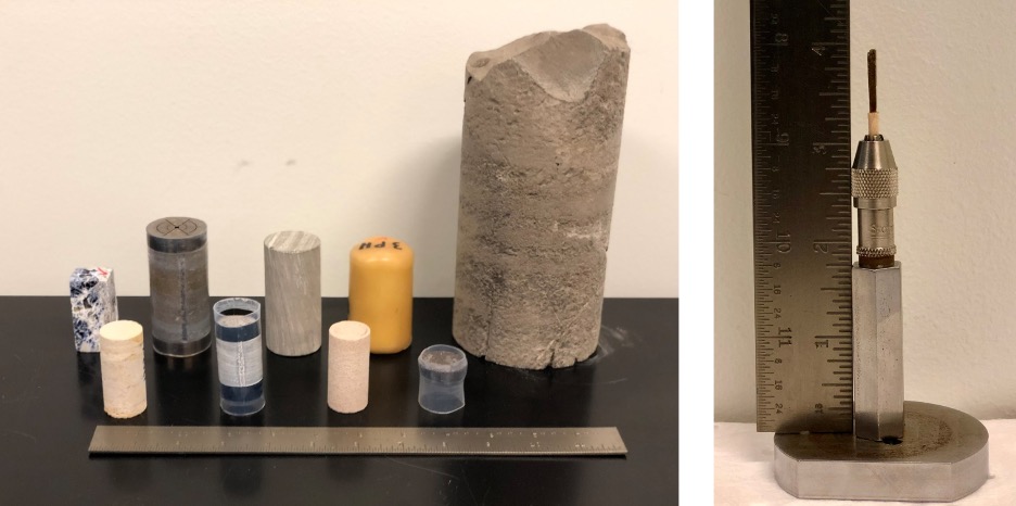 The whole core sample is typically four inches (~10cm) in diameter and hundreds of feet or meters long. From that, smaller samples are taken, which are called core plugs. I primarily receive core plugs from wells all over the world that the lab is going to be working on. These are typically 1” or 1.5” diameter and the length is typically anywhere between 1-3”.