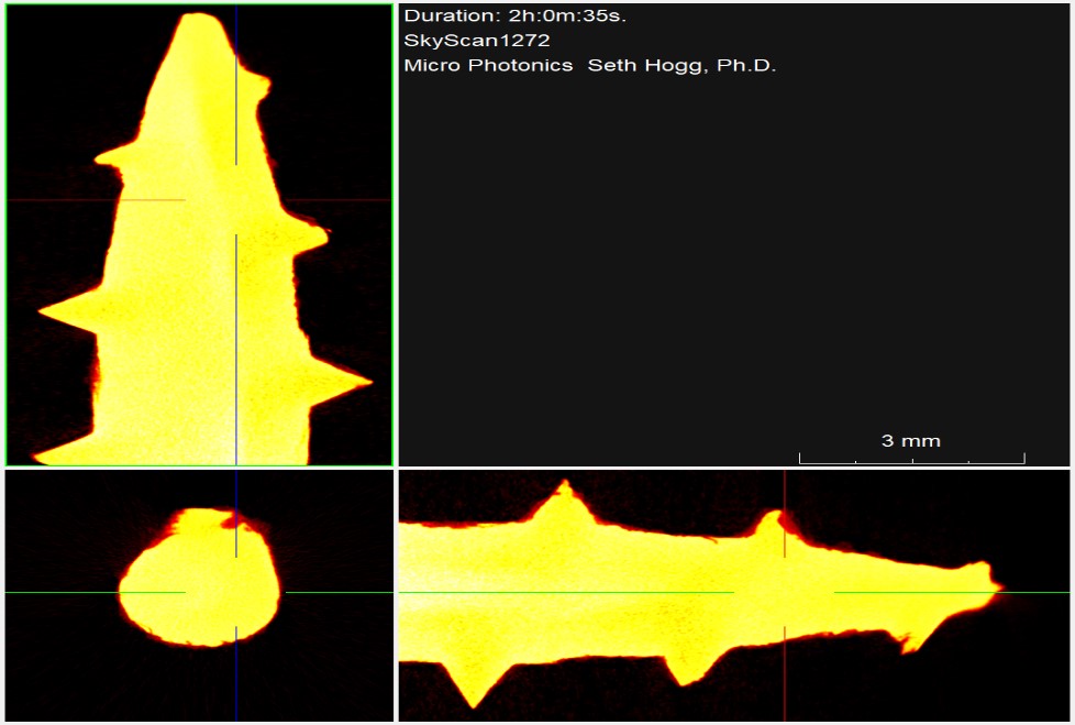 This scan was completed on our high resolution desktop SkyScan 1272 system at the Micro Photonics Imaging Laboratory in Allentown, PA. Reconstructions were completed using NRecon and visualization of 2D and 3D results were completed using DataViewer and CTVox.