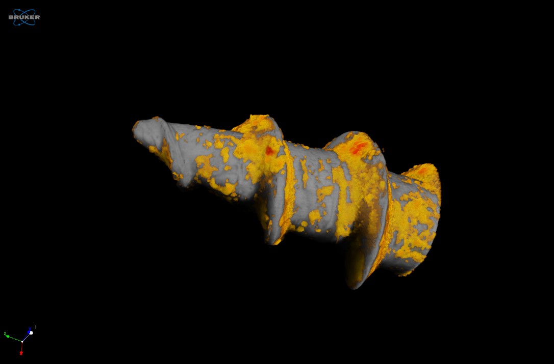 As can be seen in Figure 2, there is a generally thin but near uniform coating of rust over the region of the screw which we examined. In addition to the surface rust, we can see the loss of metallic volume, especially in the threads of the screw point. The regions with the greatest loss of volume can be seen in red in the image. The red color indicates regions with lower X-ray attenuation which would be consistent with a loss in metallic strength.