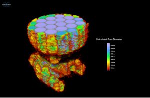While porosity of samples can be quantified via numerous available analytical techniques, all with their own positive and negative features, micro-CT uniquely stands alone as a non-destructive analysis method that captures the full volume of the sample as a 3D dataset. From these datasets, the quantification of porosity is typically straightforward and, in addition to numerical results, researchers also obtain interactive visual representations of the pore data. While knowing the overall porosity of a sample is key, knowing the localized position of pores within the sample often provides additional probative value.