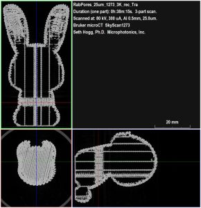 We mounted the printed rabbit model into a small plastic container and imaged it using our SkyScan 1273 desktop micro-CT at an isotropic voxel size of 25 µm. For traditional step-and-shoot imaging, we connected three acquisitions along the length of the sample to form a unified dataset with an imaging time of about two hours. We also repeated the imaging process at the same voxel size using the continuous imaging mode within the SkyScan 1273, which reduced the imaging time by about 80% down to about twenty minutes to cover the three scans along the length with a nominal tradeoff in imaging quality.