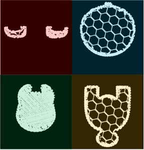 To delve deeper into the basis for the results shown in Figure 3, Figure 4 provides representative 2D slices obtained from the dataset at select points along our line graph. The ear section is shown in red with small distributions of porosity in the model while the head and body (blue and yellow respectively) have relatively high fractions of air space to plastic. Finally, our region of high infill, shown in green, highlights the relatively small amount of porosity that primarily is arising from incomplete overlap among the deposited plastic strings.