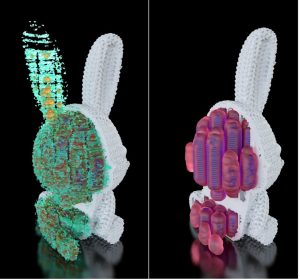 For this example, we examined an additively manufactured rabbit model produced with a fused deposition modeling printer. This type of printer creates final products through the controlled extrusion of a polymer filament depositing layers in 2D sections across the full height of the product to produce a 3D structure. In programming the printer to produce the rabbit model used for this study, we specified a region of low porosity near the base of the model where instead of a small portion of the internal volume being filled with plastic we requested the printer to significantly reduce the pore space by increasing the plastic volume deposited.