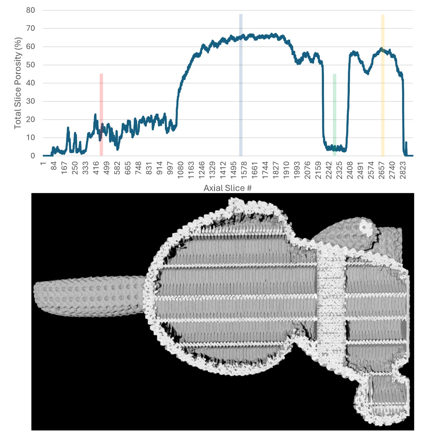 While the datasets produced by micro-CT imaging are three-dimensional, they can also be analyzed in a two-dimensional slice-by-slice basis where each slice represents another step of 25 micrometers through the sample, as in this specific case. We calculated the total porosity for each slice of the dataset from top to bottom and the results are presented in Figure 3. When comparing the results in the line graph to a clipped view through the dataset, we observe about 20% porosity through the ears, >60% porosity through the body, a drop of <10% porosity in our region of high infill, and then a corresponding increase back to ~60% porosity at the base of the model.