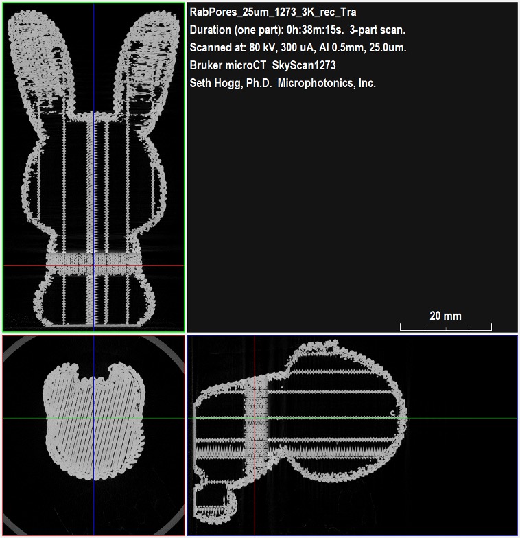 For this example, we examined an additively manufactured rabbit model produced with a fused deposition modeling printer. This type of printer creates final products through the controlled extrusion of a polymer filament depositing layers in 2D sections across the full height of the product to produce a 3D structure. In programming the printer to produce the rabbit model used for this study, we specified a region of low porosity near the base of the model where instead of a small portion of the internal volume being filled with plastic we requested the printer to significantly reduce the pore space by increasing the plastic volume deposited.