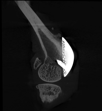 Figure 4: Multi-planar reconstruction view of femoral implant and adjacent tibia