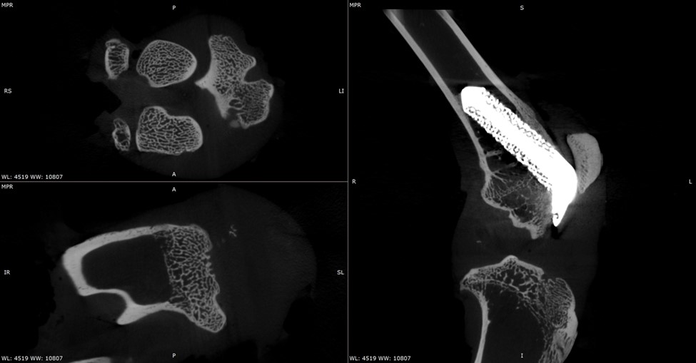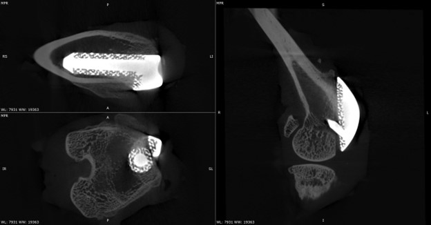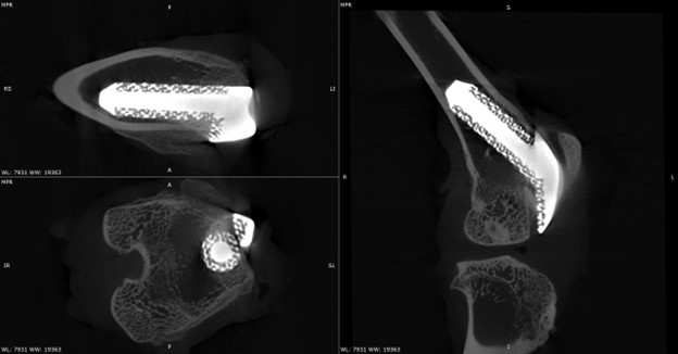 Figure 2: Multi-planar reconstruction view of femoral implant in rabbit knee model visualizing placement of implant within femoral head