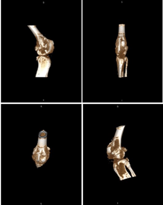 Below are micro-CT reconstructions of a femoral implant in a rabbit knee model. High-resolution imaging enables tracking of implant position and progressive changes at the implant-bone interface over time.