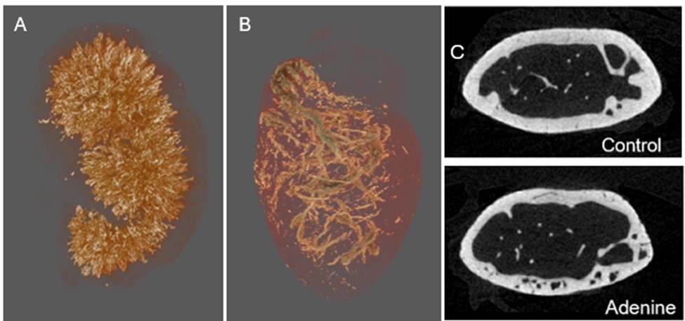 The Bruker Skyscan 1272 is the cornerstone of our research. It enables us to generate 3D renderings of bone and soft tissue, giving a glimpse of the geometry and morphometry of tissue samples. We focus on analyzing both the cortical and trabecular bone and look for phenotypic differences in our experimental groups. Scanning bones ex-vivo also gives us the ability to determine tissue mineral density and porosity of our samples. Since this technique is non-destructive, we can use the same samples for other chemical and mechanical tests following micro-CT imaging. Soft tissue, like kidney and heart, are also scanned to look for damage or vascular calcification.
