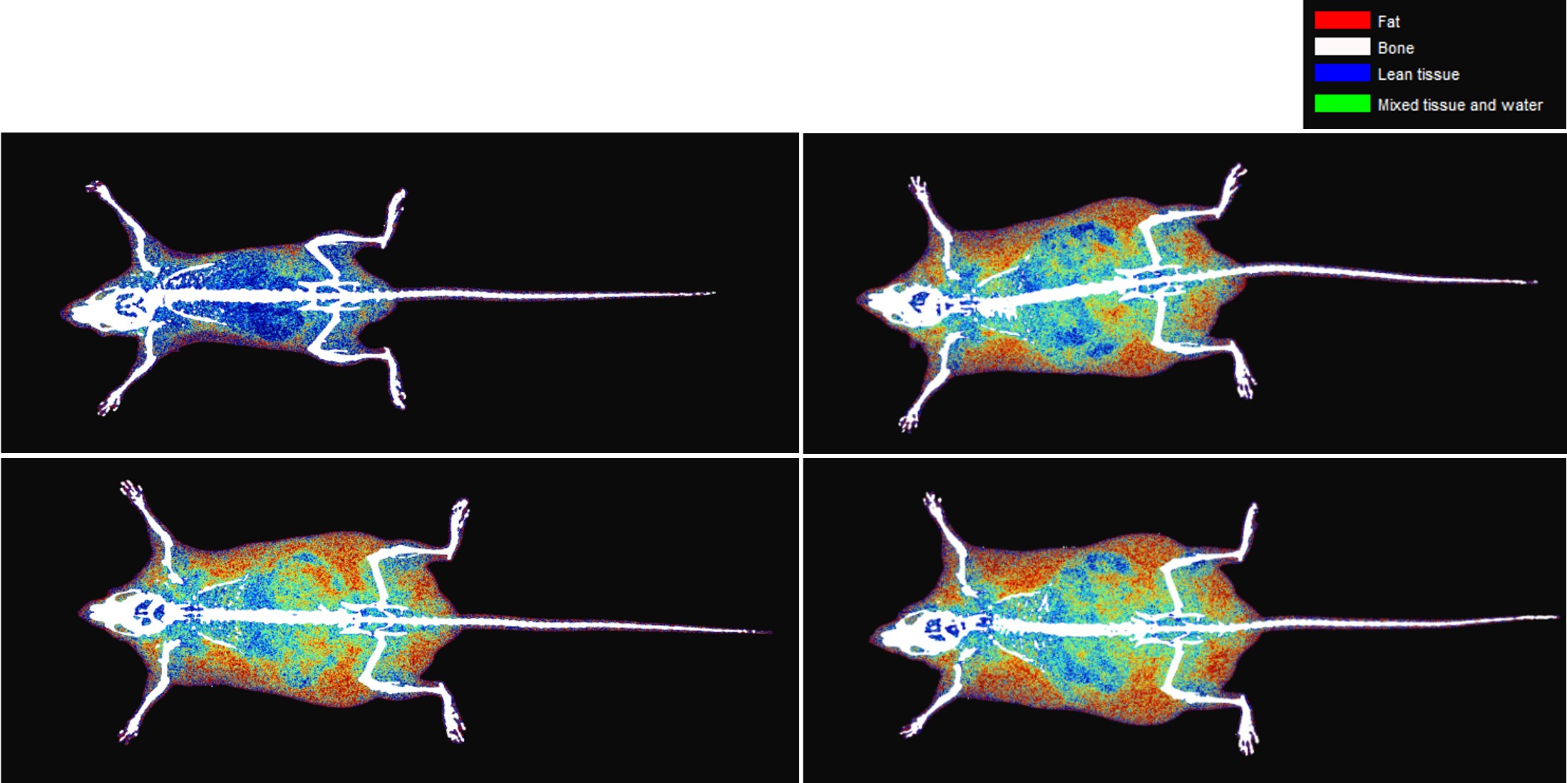 The InAlyzer2 DEXA (Medikors) allows us to collect longitudinal data from live animals that elucidates the changes happening throughout a study on the same cohort of mice. For our diabetic models, we can track the body composition over time after the introduction of a high fat diet. In addition to ex-vivo BMD bone measurements with the micro-CT, tracking changes to bone mineral density with in-vivo DEXA scanning also gives insight into disease progression and severity. This type of imaging also provides a clinical surrogate since this is the same type of imaging performed in human patients when diagnosing bone disease or assessing treatment efficacy.