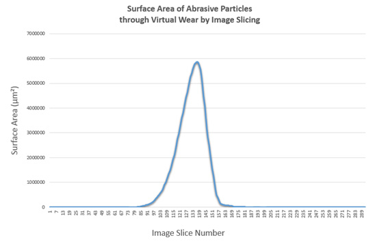 The goal of micro-CT scanning the sandpaper was to clearly measure the surface area of the abrasive material at each slice, therefore we selected a small pixel size while maintaining a large viewing area. Using a 6mm by 15mm section of sandpaper for the scan, at a pixel size of three microns, we were able to easily threshold and analyze the amount of abrasive material. The final result is surface area measurements over 292 images slices that are graphed to show a uniform virtual sanding (Figure 3).