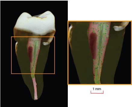 Figure 3: Pseudo-colored 3D volume rendering of a filled human tooth, enabling the segmentation of voids, 4 μm isotropic voxel size