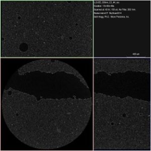 Removing a small piece of chocolate from the larger segment imaged by the SkyScan 1272, the extra-dark formulation was also imaged using the SkyScan 2214 nano-CT for an enhanced view of the components within the chocolate bar (Figure 5). In reviewing the resulting reconstructed dataset, signs of small angle scattering were visible including the bright edges of the sample leading us to believe that application of a Paganin single distance phase retrieval function to our projection data could enhance our images. Using NRecon 2, we applied the function to a second copy of the dataset following the principles outlined in Bruker Method Note 133 and then reconstructed the resulting images producing the enhanced contrast seen above. While some resolution is ultimately lost during the phase retrieval process, in many cases the additional contrast which occurs in the sample is more important to interpretation and examination of the dataset.