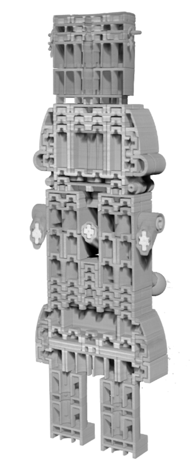 Using CTVox, we quickly rendered a live volumetric view through our dataset in 3D space as shown in Figure 3. In this view, we see the connection points between all the individual bricks used in the assembly. We also observe differences in the plastic density for some of the bricks from one another. While most of the bricks are similar in density, the bricks used for the hat are lower in density than most of the bricks used for the body. The rod supports used for the arms and lower jaw are the highest density, as shown by their relative brightness in the reconstructed images.