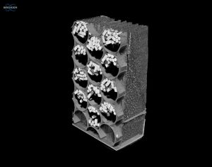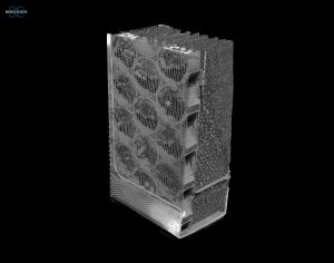 Using CTVox, we can digitally cut away the pre-filter layer to reveal the underlying structure (Figure 3). The next region within the filter assembly is a polymeric honeycomb style mesh containing activated carbon pellets. A thin mesh is visible, used to restrict the activated carbon pellets into their respective honeycomb style holes within the larger plastic mesh. It is interesting to note that the pellets are free-flowing within each hole and do not fill the entire volume.