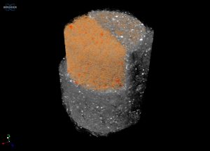 Figure 7: Colorized volumetric rendering of the pores (orange) within an activated carbon pellet (gray)